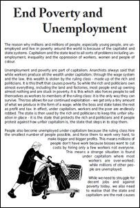 Thus we anarchists see the basis for these divisions in our class as being the class nature of society and in particular the ruling class’s need to divide us. We do not deny that racism, sexism, sectarianism, et al exist, but we understand that the ruling class is responsible for them, that when our class fights against the ruling class we simultaneously fight against these prejudices because active participation in the class war emphasises the unity of our interests as a class and brings us together in struggle. We anarchists also feel that only the elimination of capitalism and class society will prepare the conditions possible for the final elimination of oppression: economic, cultural, psychological and in all the other forms that it affects our class.